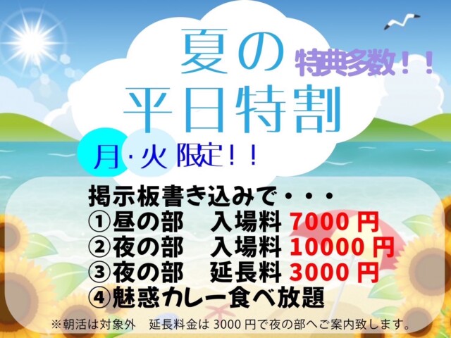 【新宿 SCARLET】夏の特別割引をチェック! ニュースリリース 2024.07.30月曜日、火曜日限定で昼の部 入場料7000円夜の部 入場料10000円延長料金は 3000円でご案内させていただきます。さらに‼月・火はオープンから絶品カレーをご用意💓スタッフY監修の絶品性欲爆増カレーを是非召し上がってください!!皆様のご来店をお待ちしております♪